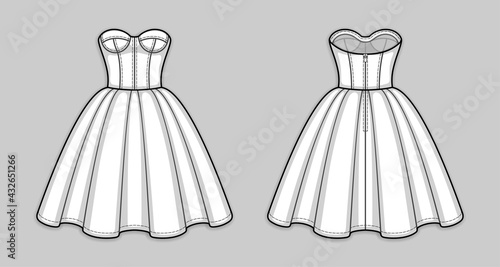 Knee Length Corset Bodice Dress With Strapless Neckline Panel Lines And Cups Seam At Waist Back Zip Closure Flared Skirt With Pleats Back And Front Technical Flat Sketch Vector Illustration Back Wall Mural Ba Tatiana